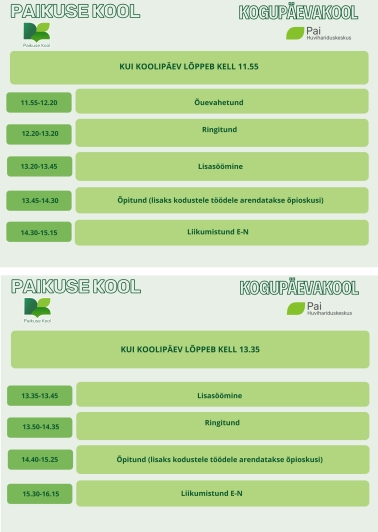 Kogupäevakooli tegevustega liitub õpilane pärast tunniplaanijärgset õppetööd. NB! Palume jälgida igal perioodil tunniplaani, sest see muutub lähtudes üldhariduskooli tunniplaani muutustest. Nt I perioodil lõppeb 1. klassi õpilasel E-T tunnid 13.35 ja K-R 11.55, seega on tal nädalas kaks erinevat ajagraafikut, mida kogupäevakoolis jälgida.