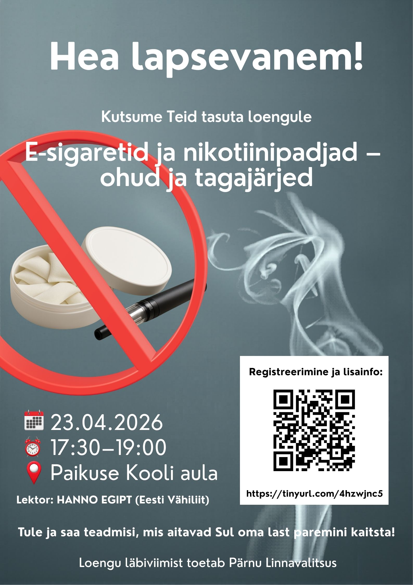 Pärnu Raeküla ja Paikuse Kool kutsuvad osalema koolitus-loengul "E-sigaretid ja nikotiinipadjad –ohud ja tagajärjed".