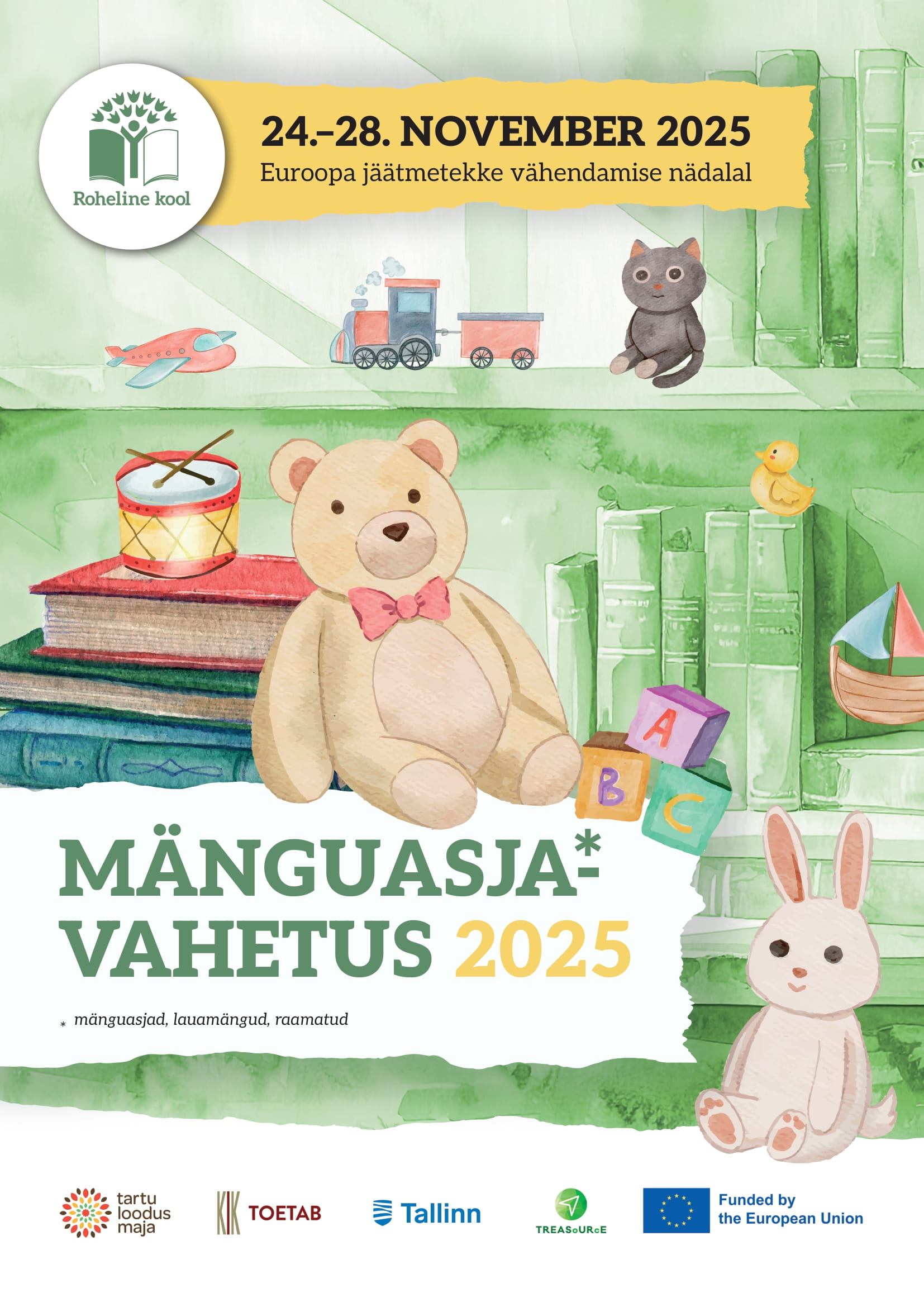 24.-28. november 2025 toimub Mänguasjavahetus, mille eesmärk on vähendada tarbimist ja jäätmeteket, õpetada lastele ja noortele taaskasutuse ning jagamise väärtust ja tugevdada kogukonnatunnet. Laste kaudu jõuab mõju ka teiste pereliikmeteni.