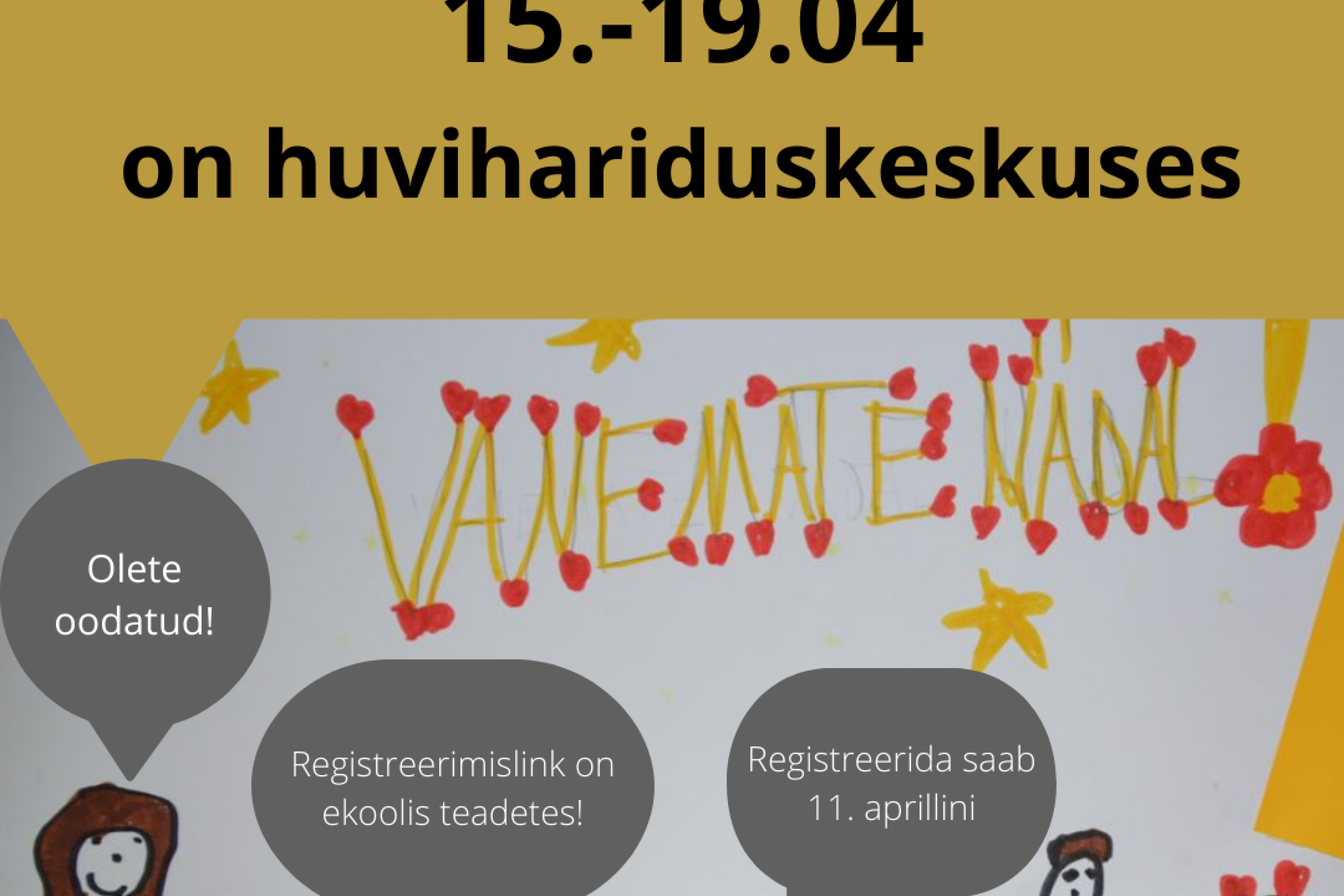 15.-19. aprill on huvihariduskeskuses PAI Vanemate nädal. Lapsevanematel on võimalus tulla huvihariduskeskusesse tutvuma lapse tegemistega. Vajalik on eelregistreerimine. Registreerimislink on e-koolis teadetes.