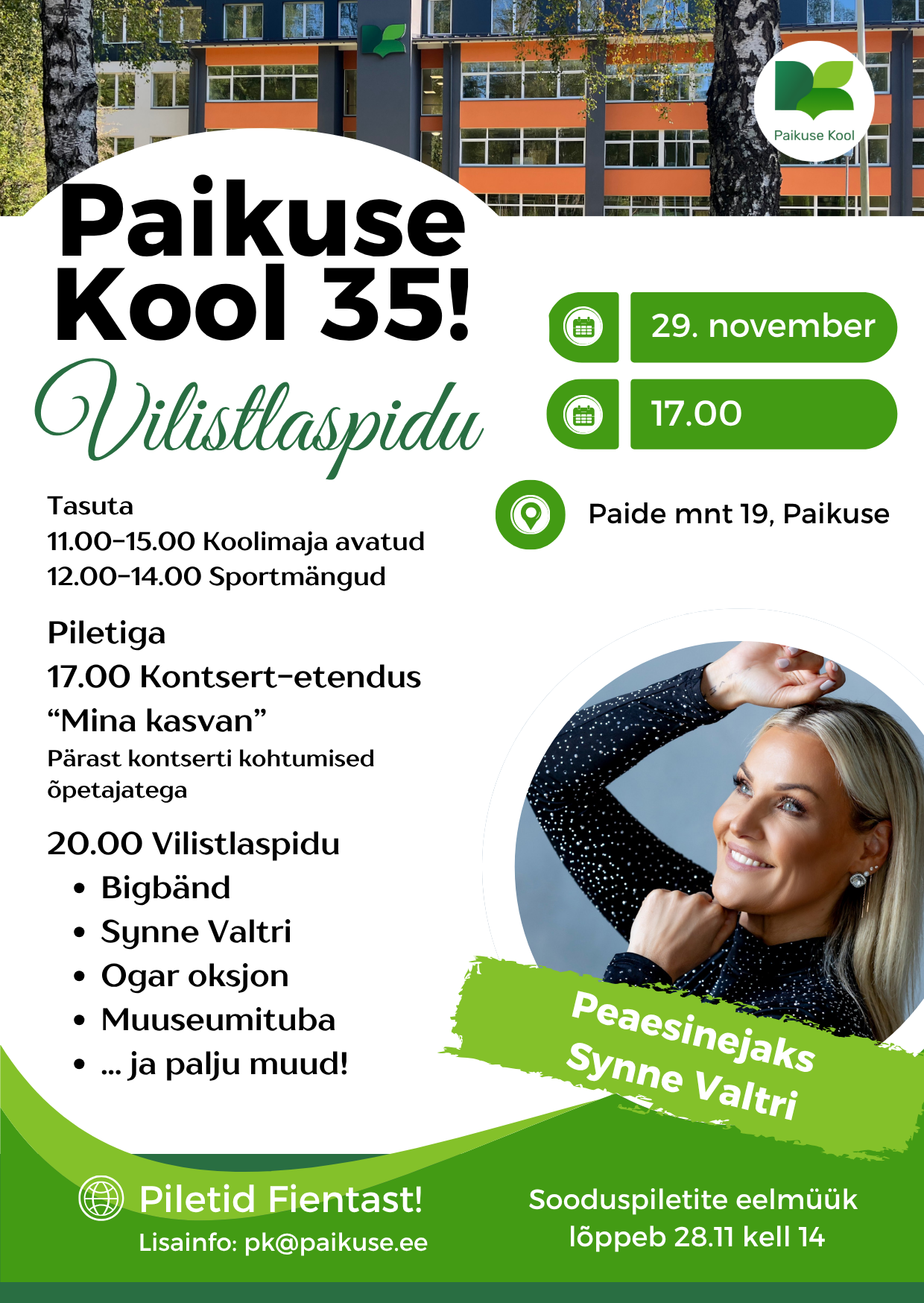Paikuse Kool saab 35! Sel puhul ootame vilistlaspeole kõiki oma vilistlasi ja praeguseid ning endiseid õpetajaid ja töötajaid.